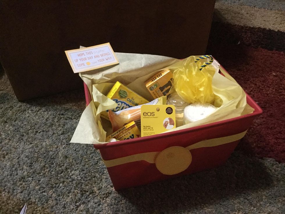 Now, put in the beauty products like the eos and make-up remover wipes that are in a yellow wrapper.
