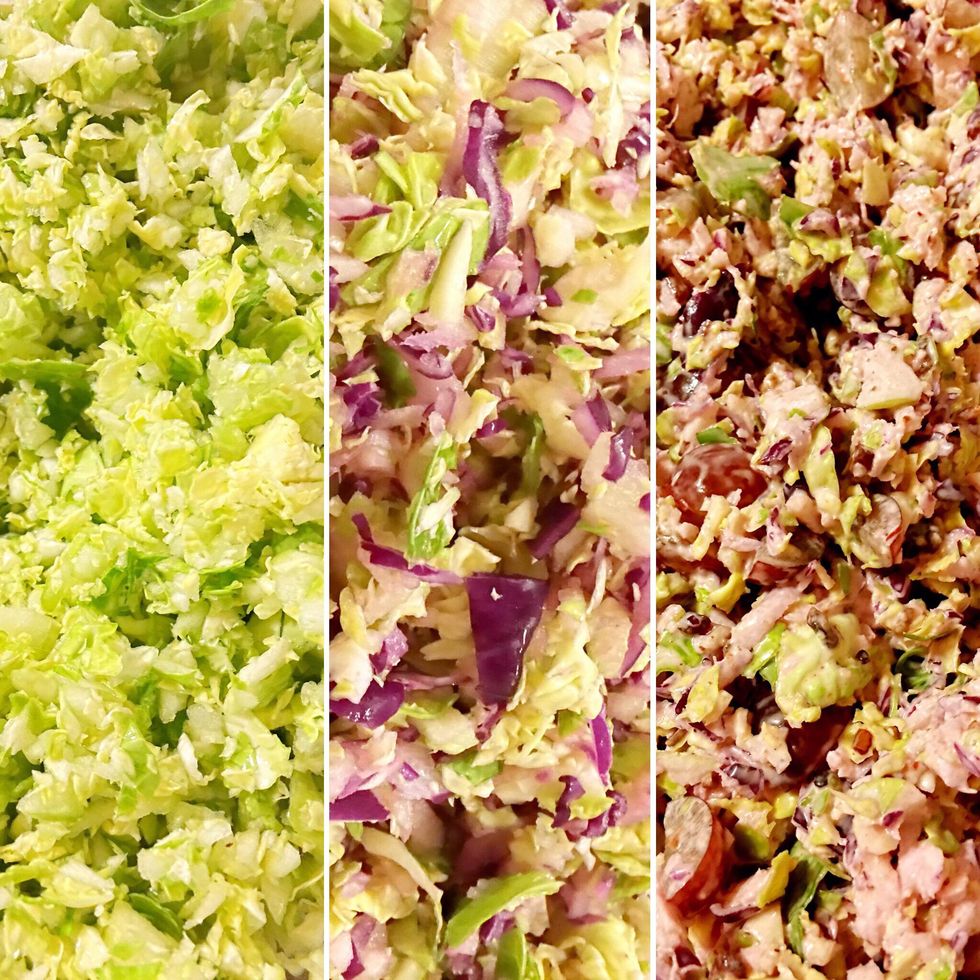 Grate/chop/process 1/4 head of purple cabbage. Mix sprouts, apple and cabbage into the large mixing bowl. Stir well.