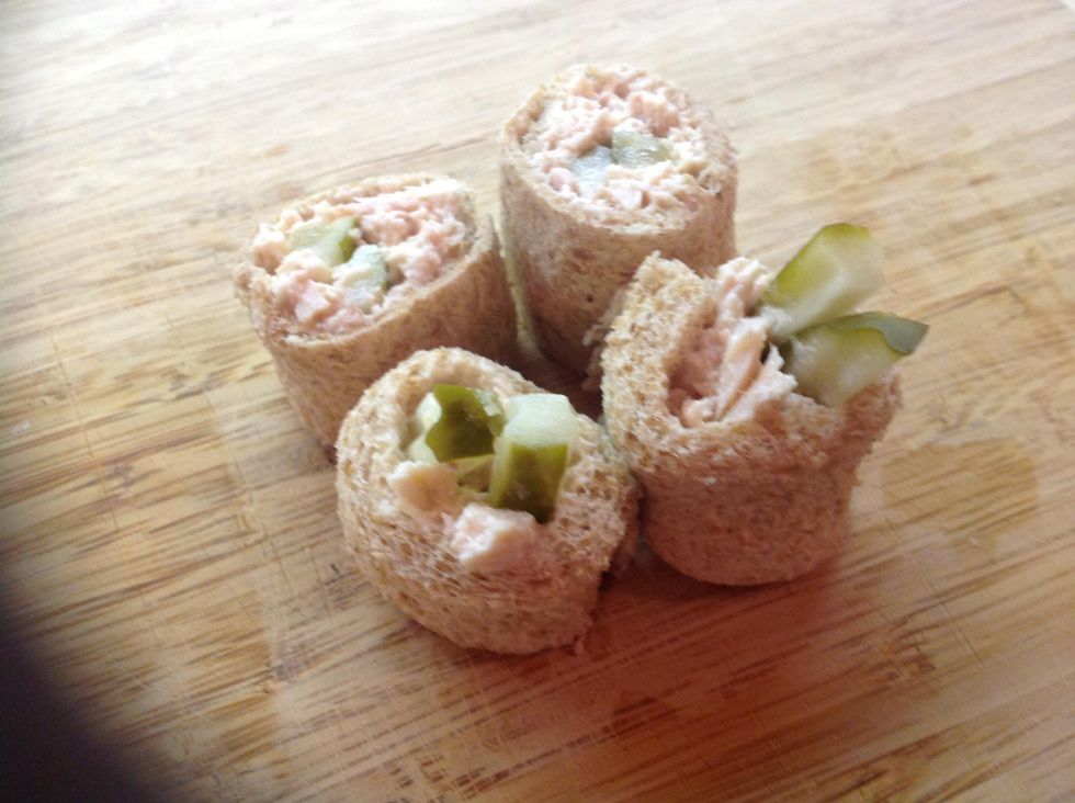 Starting with the long edge of the bread covered in tuna, gently roll into a tube. Lay the tube on the cutting board seam side down.