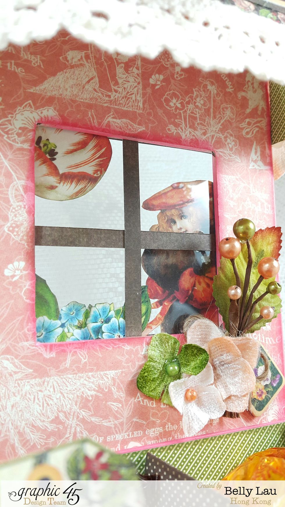 Adhere a piece of pattern paper of 5"(w)x7"(h) for the box backdrop, and cut the window out.