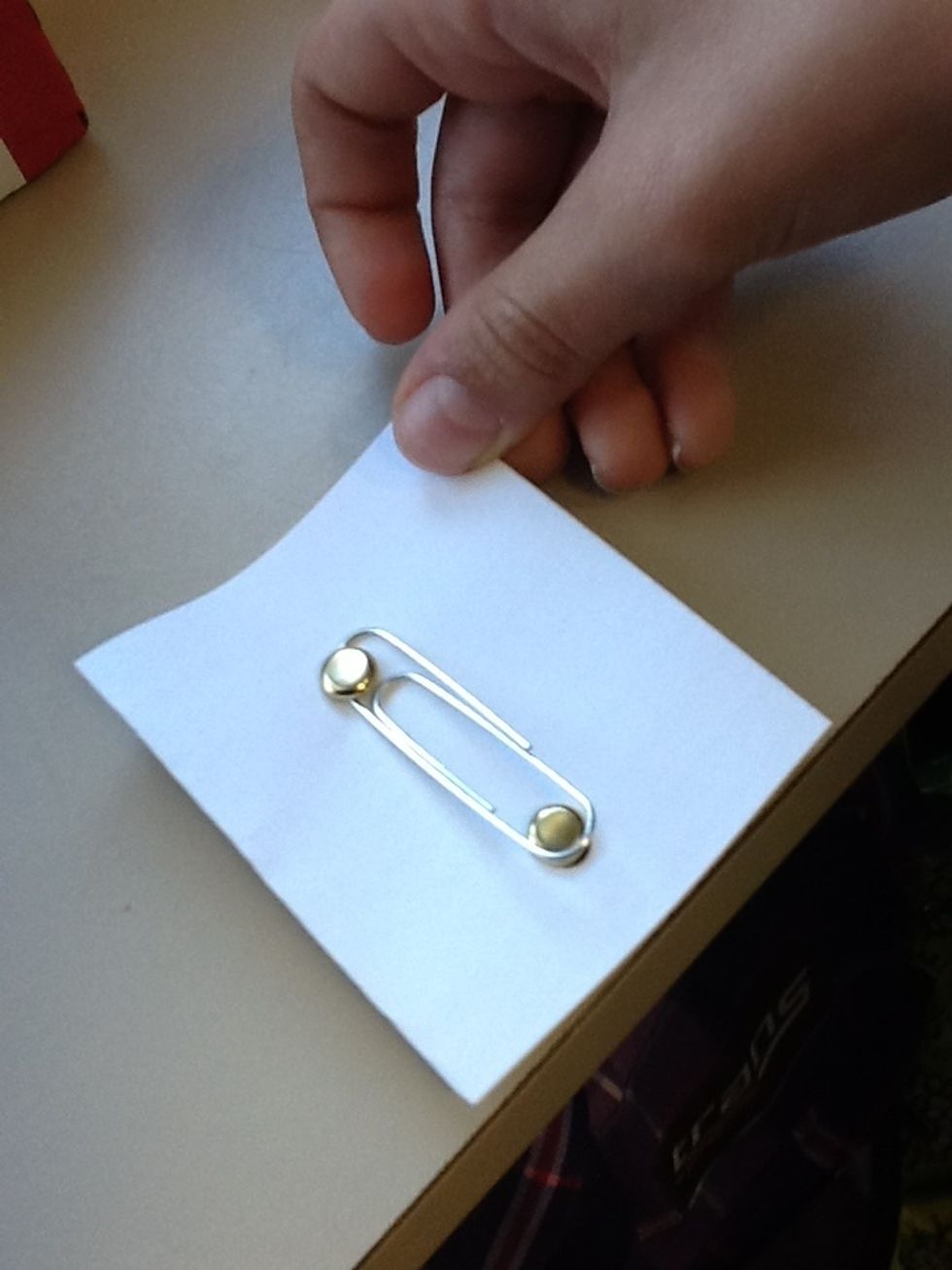 Punch a hole through the index card close enough for the paper clip to touch. Put the other paper fastener through this hole and fasten to the index card.