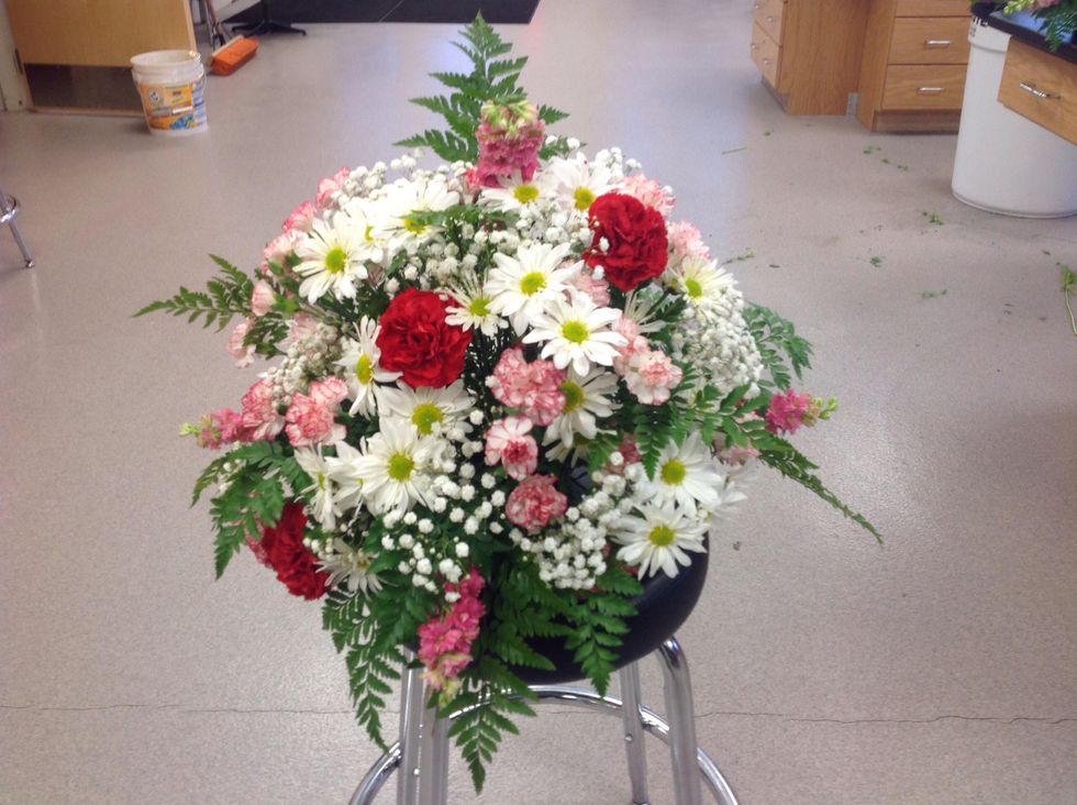 Now is when you green the back! Cover the Oasis with small pieces of Leatherleaf that you have left over. After doing this, your arrangement will be complete! Enjoy!