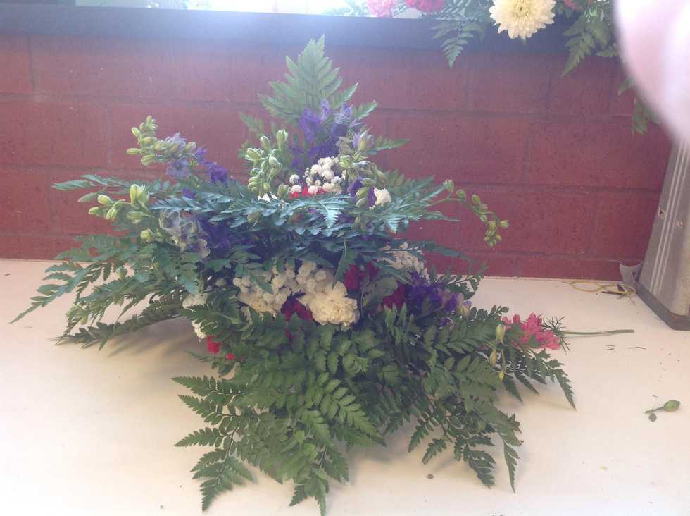 Last fill in your arrangement with flowers using larkspur, standard carnations, and mums to complete it. Make sure to also have gyp placed within the arrangement to compliment your final piece.