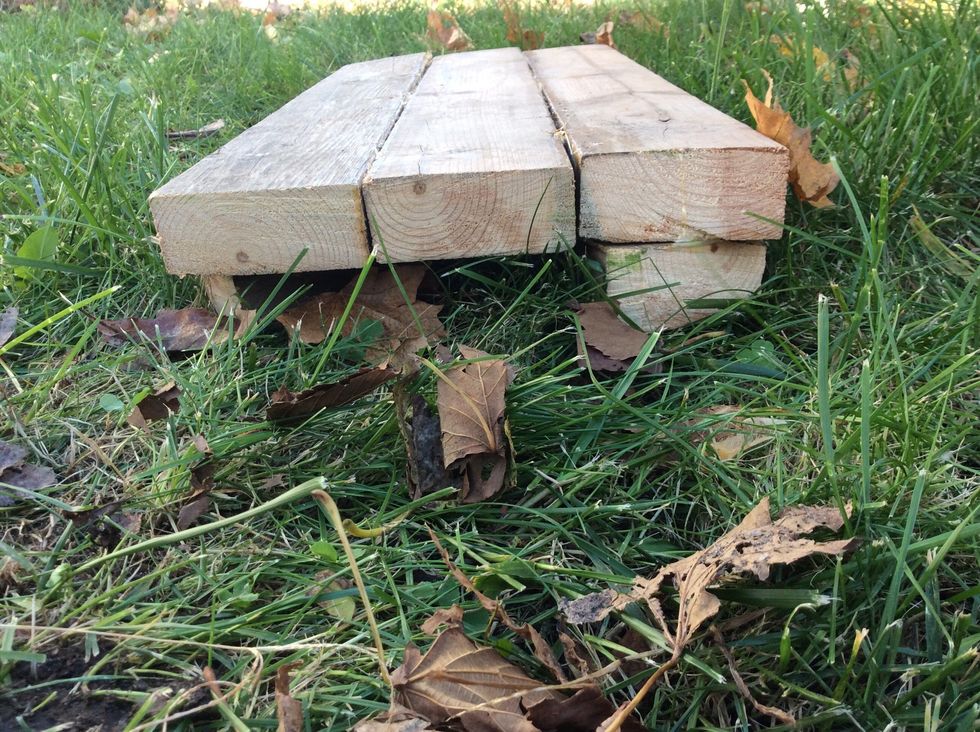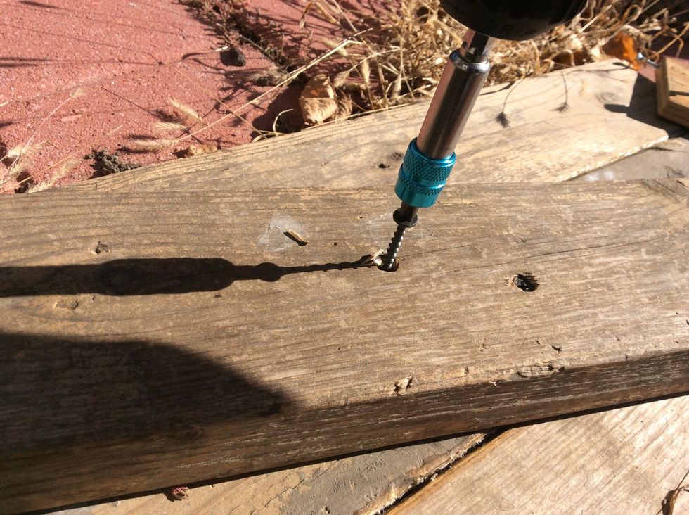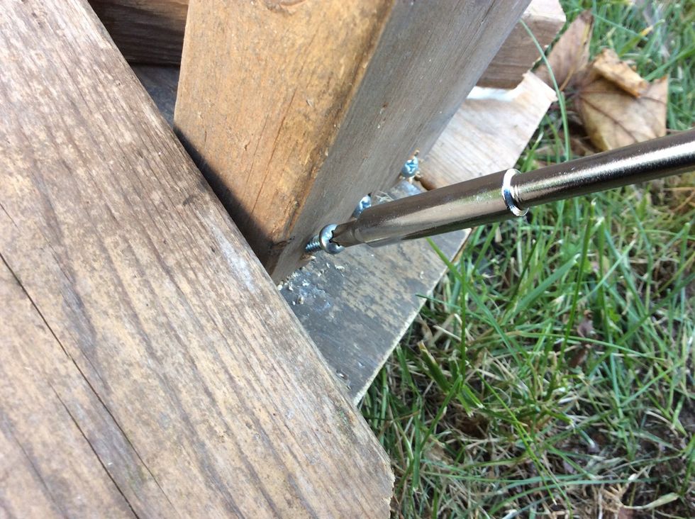 Cut one piece of wood into the two pieces of wood that are circled, then screw in screws in the places that the screws are circled.