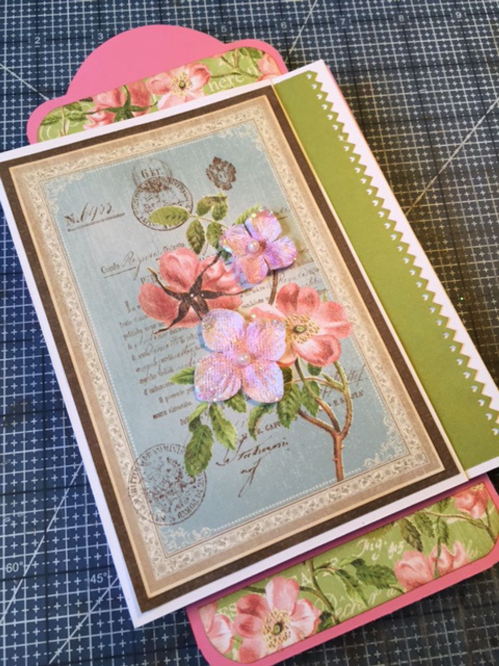 Add patterned paper and embellishments to inside flaps/pages.