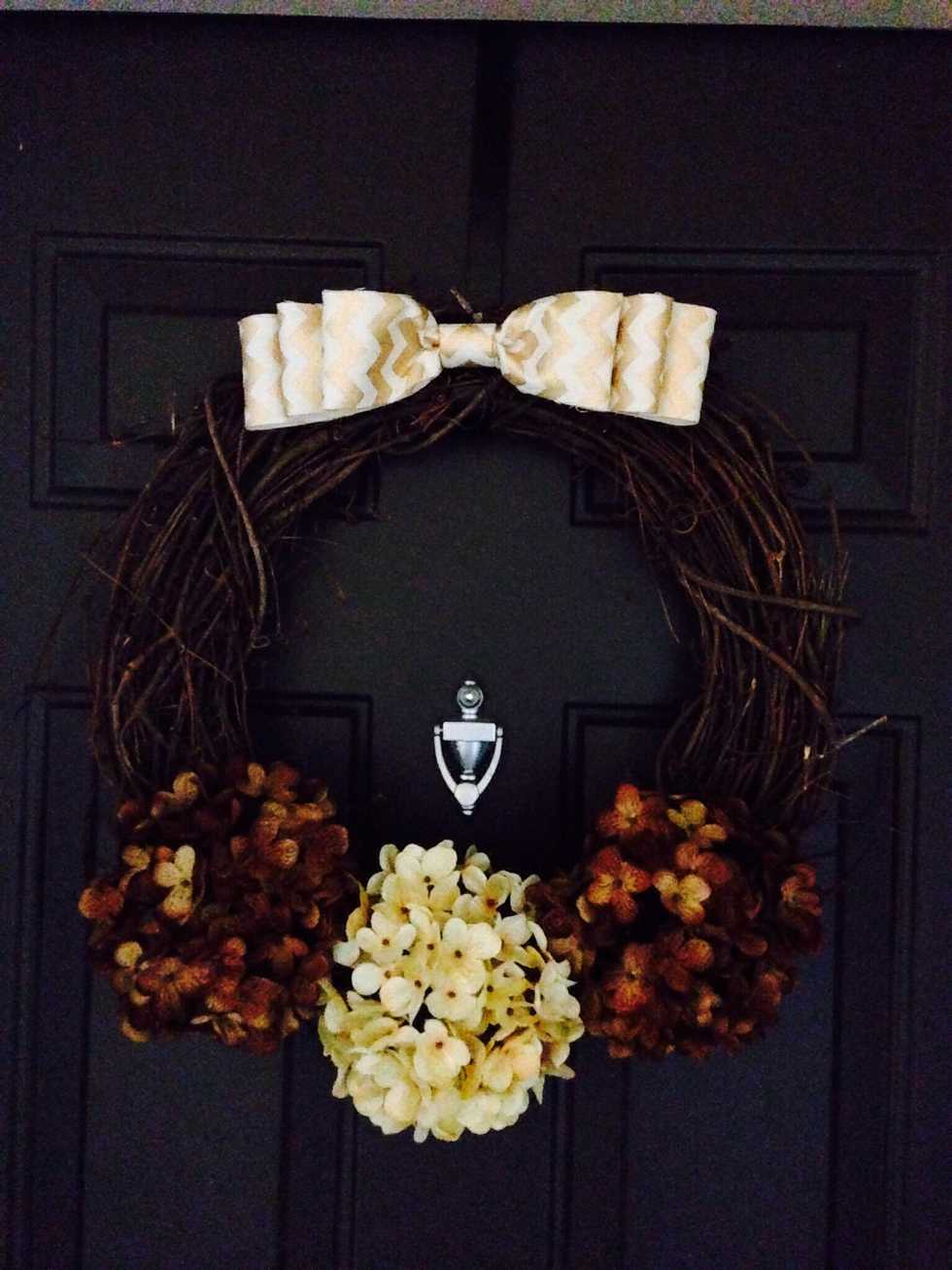 Gather your hydrangeas, wreath, wide ribbon, hot glue gun, and scissors.