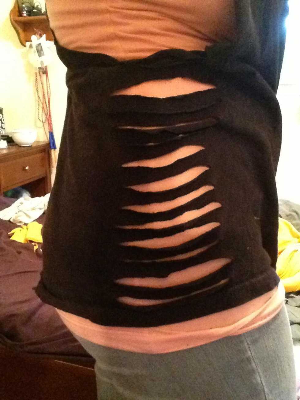 Fold you shirt flat in half making sure that the sides are flat and evenMilo says hi!!Cut a line as low as you want, I would do abut 1/2 and inch downCutDo the same and continue to do so all the way down the sideAnd your done!!