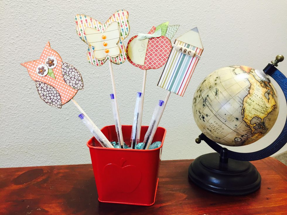 Now we are going to attach everything together. You are going to need a popsicle stick, or dowel and some pens to attache the pen toppers to.