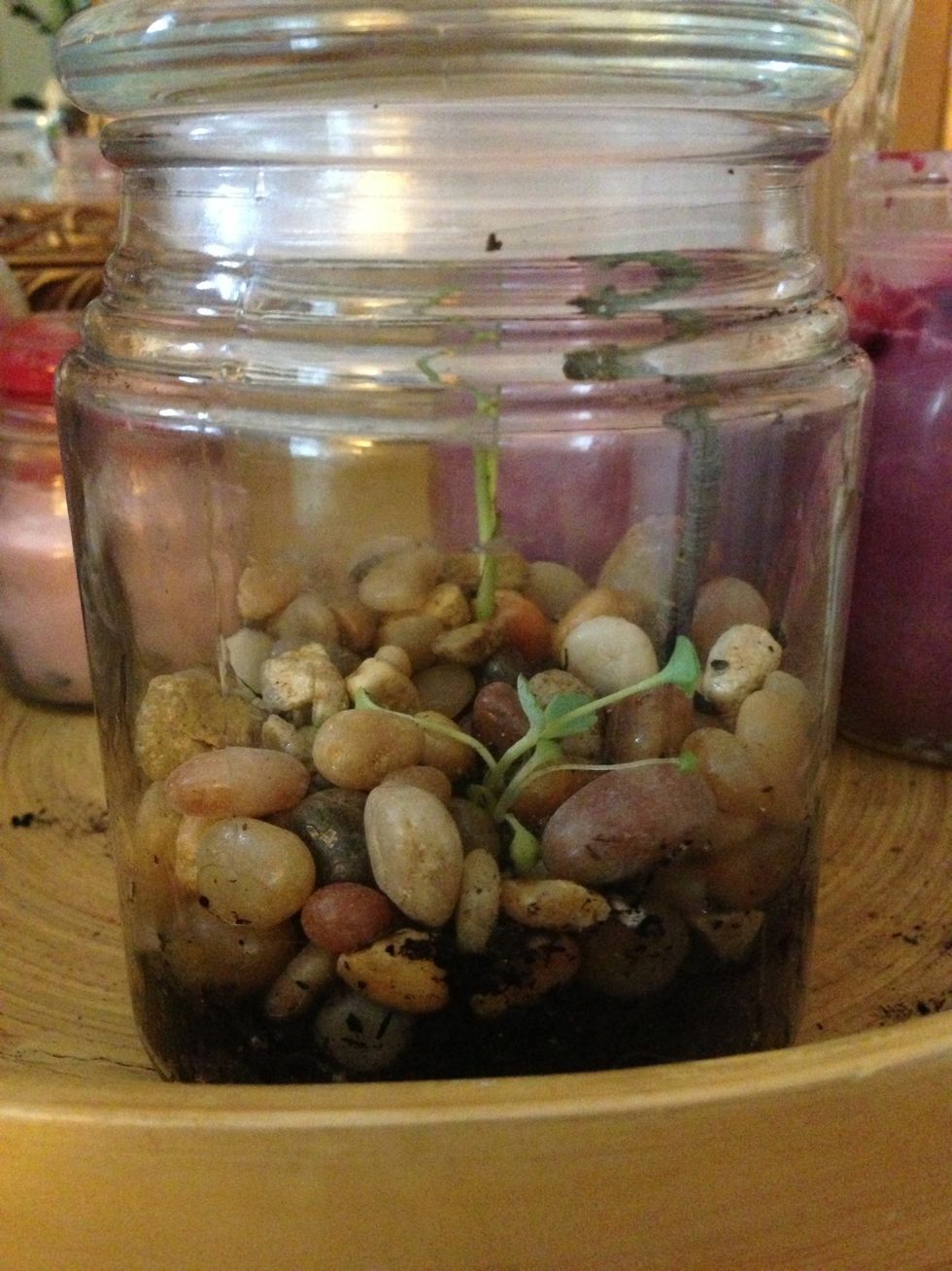 Here's an established terrarium, from which I took the new succulents. If you see too much condensation, or plants look rotten, leavd lid off for a couple of hours. If plants look dry, mist lightly.