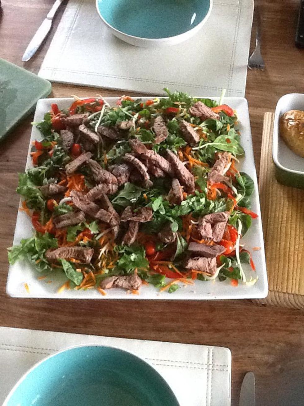 Chop the beef into smaller slices. This will go on top of the salad.