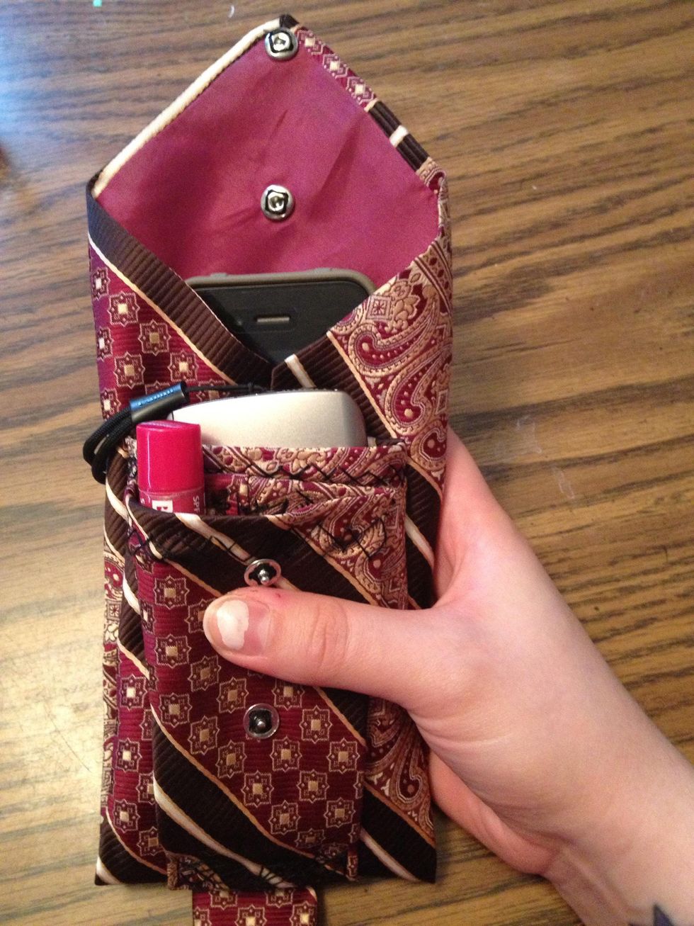 Now I have a three pocket pouch made from a men's tie!