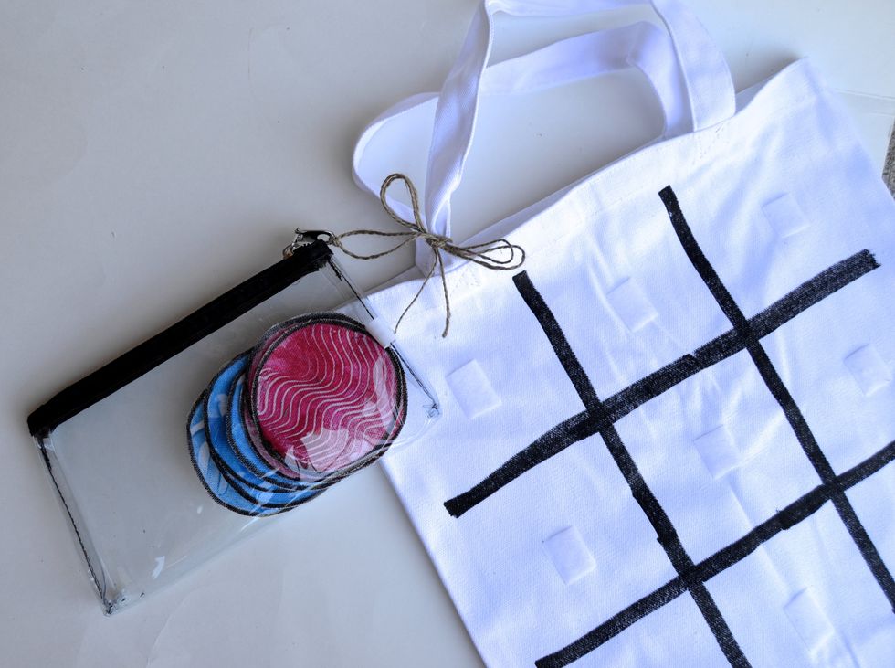 To keep your pieces safe between games, use hemp or ribbon to attach a small zipper pouch to one of the straps so that it can hide inside the bag when not in use. This is a makeup pouch from Walmart.