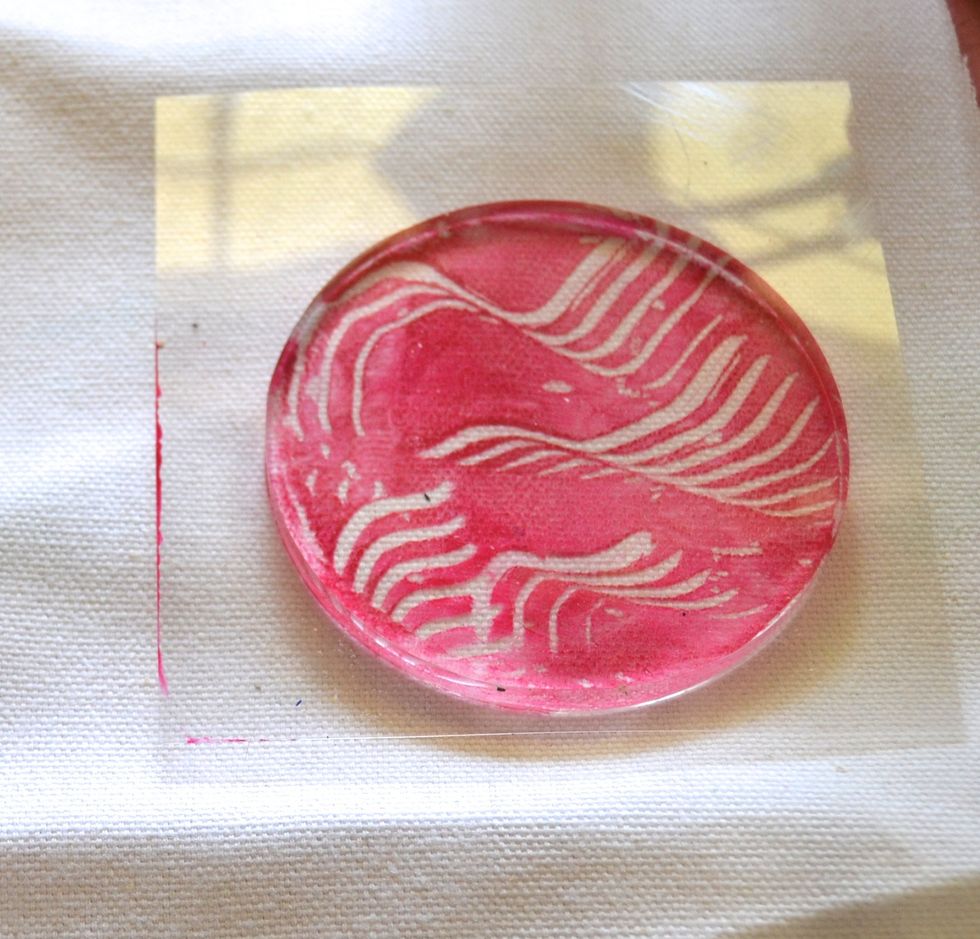 Using your small circle Gel Press™ gel plate, add a few drops of DecoArt So Soft paint. Brayer the paint across the plate and use found materials (lids, skewers, etc) to etch designs in the paint