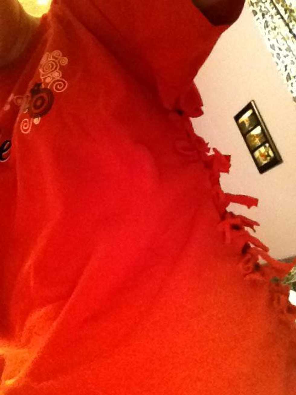 It should look like this once both sides are cut. Make sure you do not separate the front and back of the shirt.