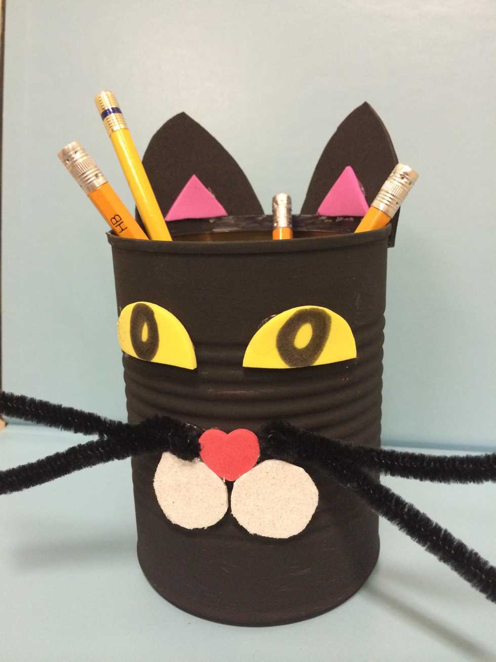 On the front of the can, glue on two eyes, a nose, two circles to make the muzzle. Let it dry and then remove any excess glue strands.