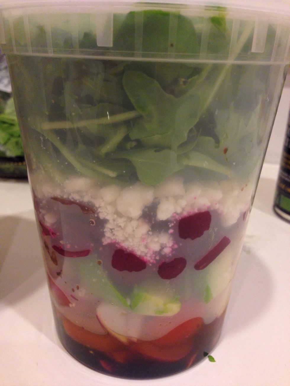 Add arugula (or any greens). You can really stuff it in there if you want. It's hard to shake the container (and mix the dressing with the salad) if it is very stuffed. You can also add chicken/nuts.