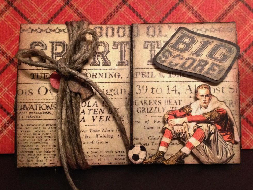 On the front Distressed twine and wrapped it around. Fussy cut out some images and popped up Big score that I first glued on black paper. Hope this is helpful and have fun creating :-)