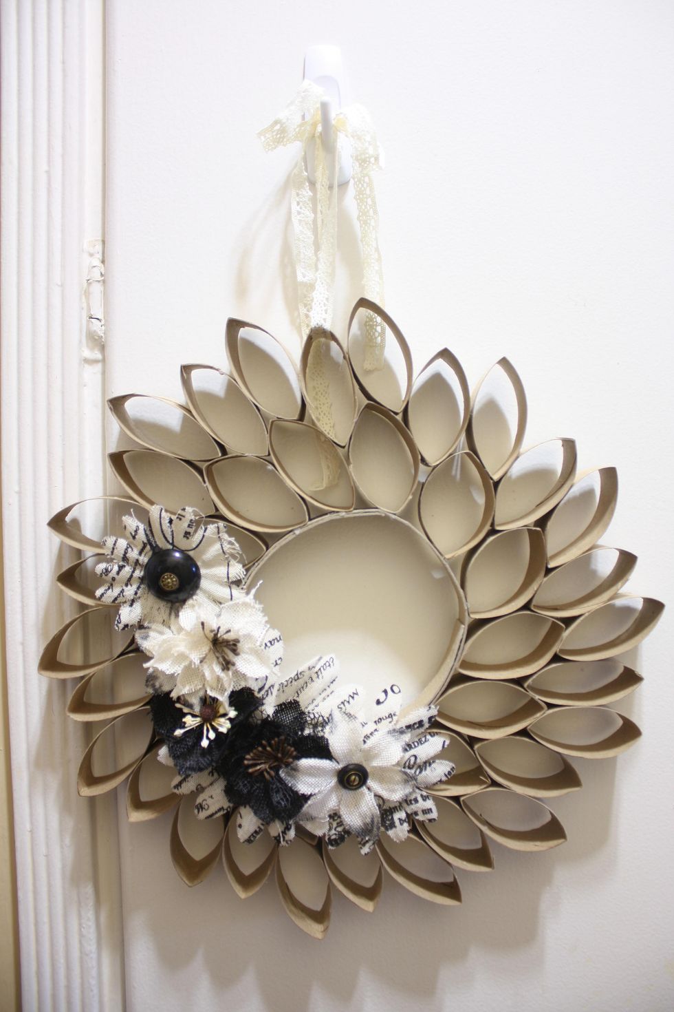 for the last row, I add in the ring and hot glue where I am pointing out on the wreath- just one dab