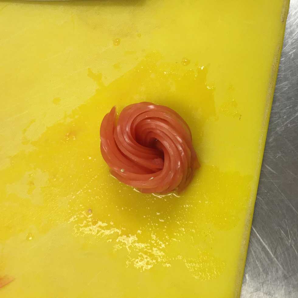 slice off the edge then slice the tomato half into extremely thin slices. it is important that all the slices stay in order.