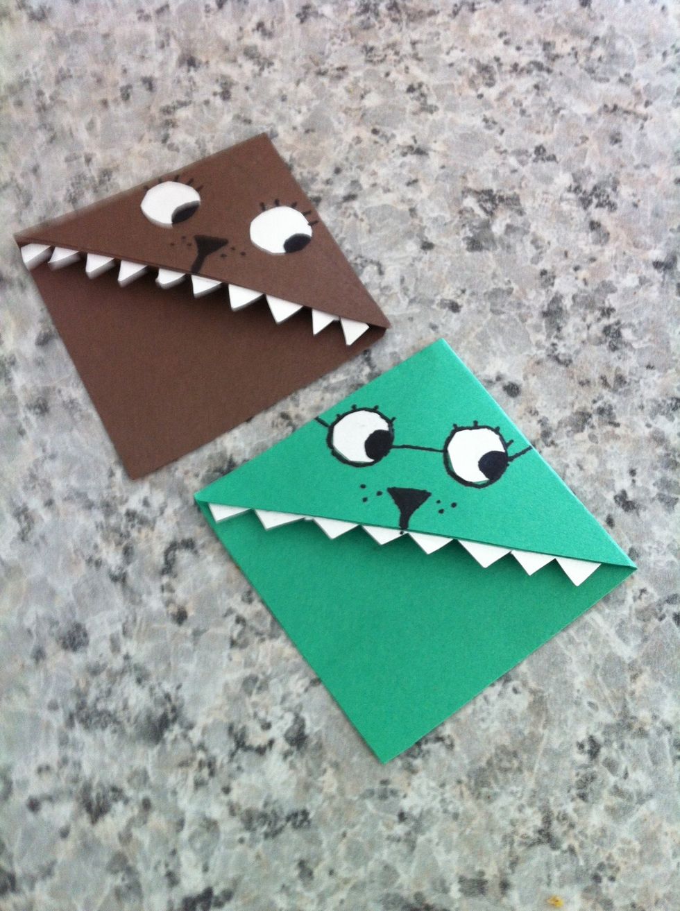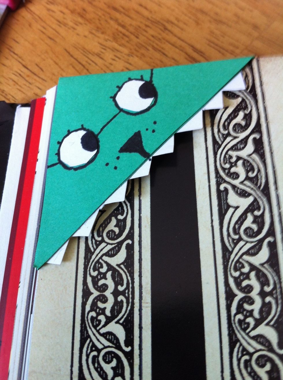 Glue the teeth to the top of the inside. Do not glue the teeth to the bottom, for the page will be going in. Also glue on the eyes.
