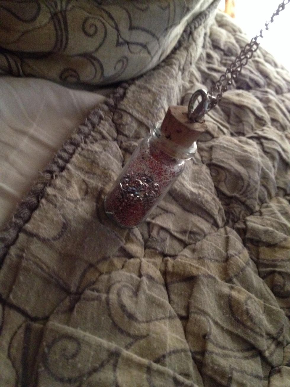 Get a bootle with a corkPour anything you would like in the bottle I put glitterSuper glue the cork to the bottlePress the hook into the corkConnect the chain to the hookYou have you beautiful necklace