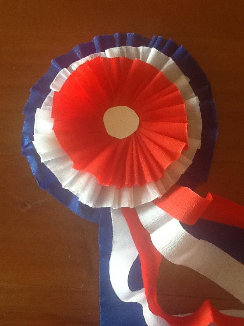 Cut narrow strips of blue, white and red paper and staple to the blue rosette.