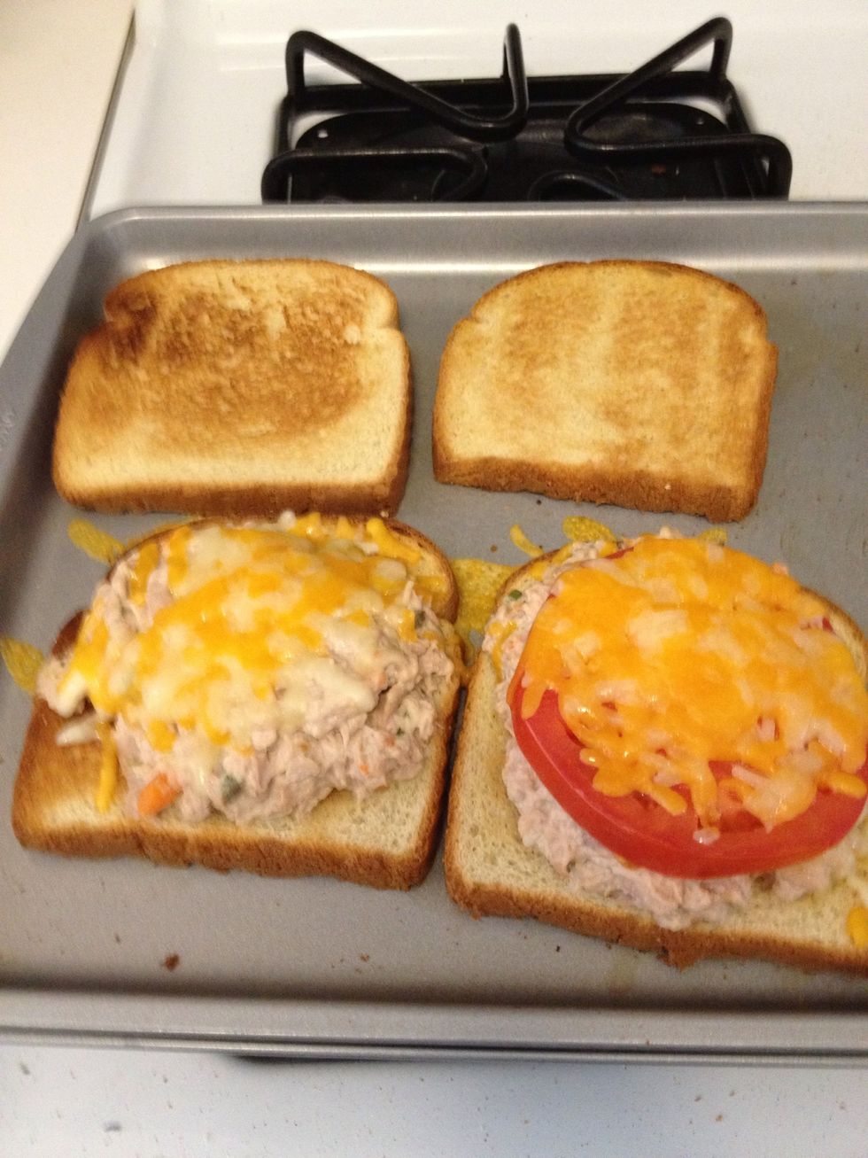 Preheat oven to 350. Toast 4 slices of bread. Place on a baking sheet and put the tuna spread on. Top with cheese and tomato. I don't care for tomatoes, but my wife does.
