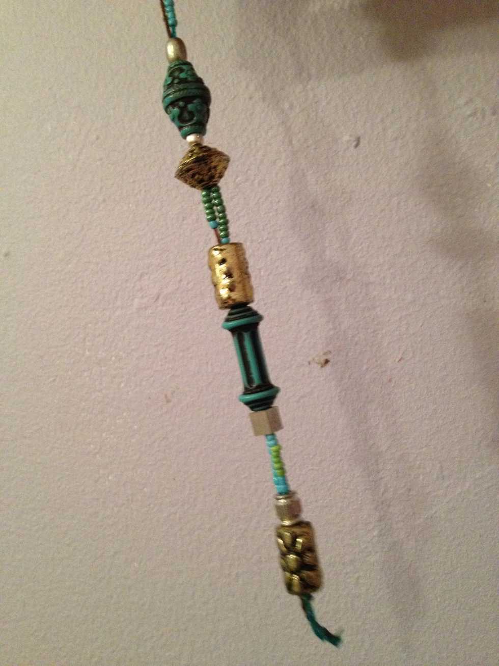 Tie a knot at the end of BOTH strings together, and add a round bead(not a long like the pic!) Then tie another to lock it in.Start adding beads:)many little beads ,one big, one big, little beads etc.