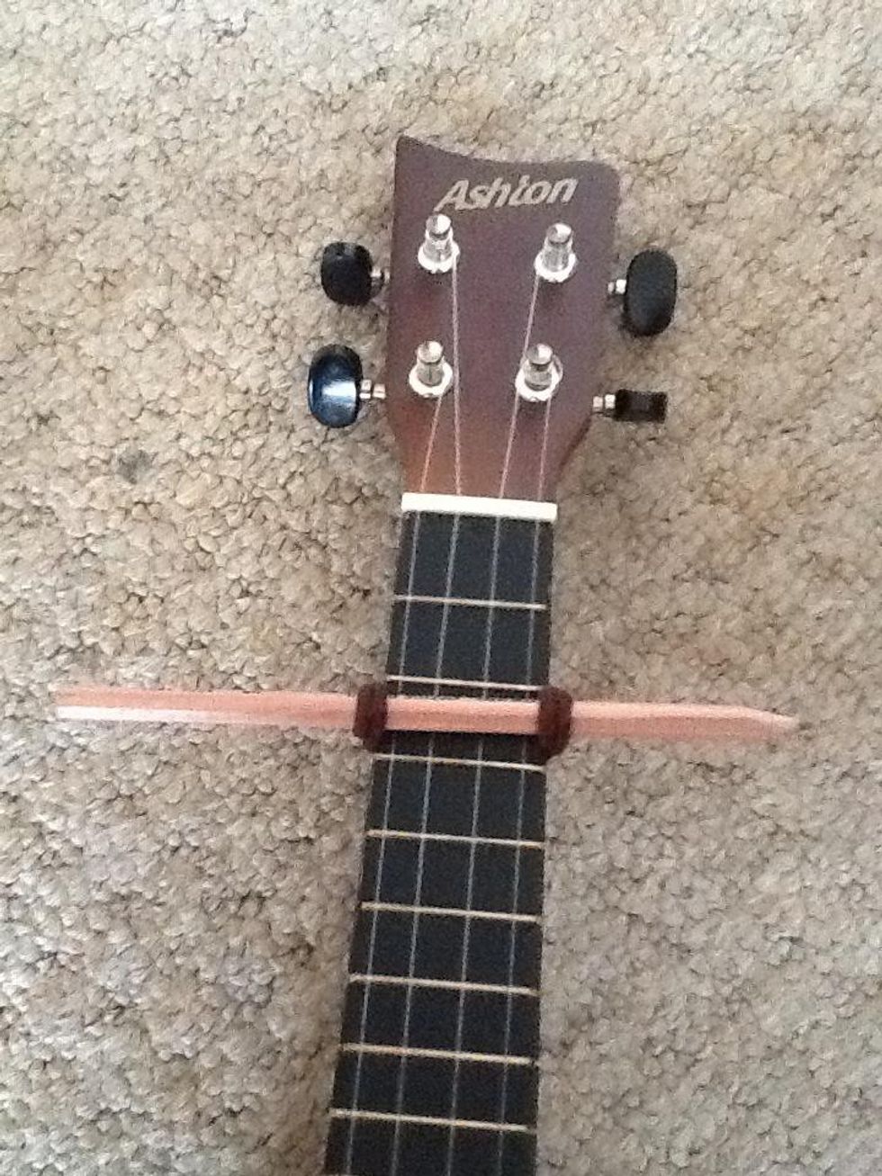 You will need a pencil and a hair bobble/tiePlace the pencil on top of your ukuleleAttach the bobble/tie around the backTighten it my tying it around again!