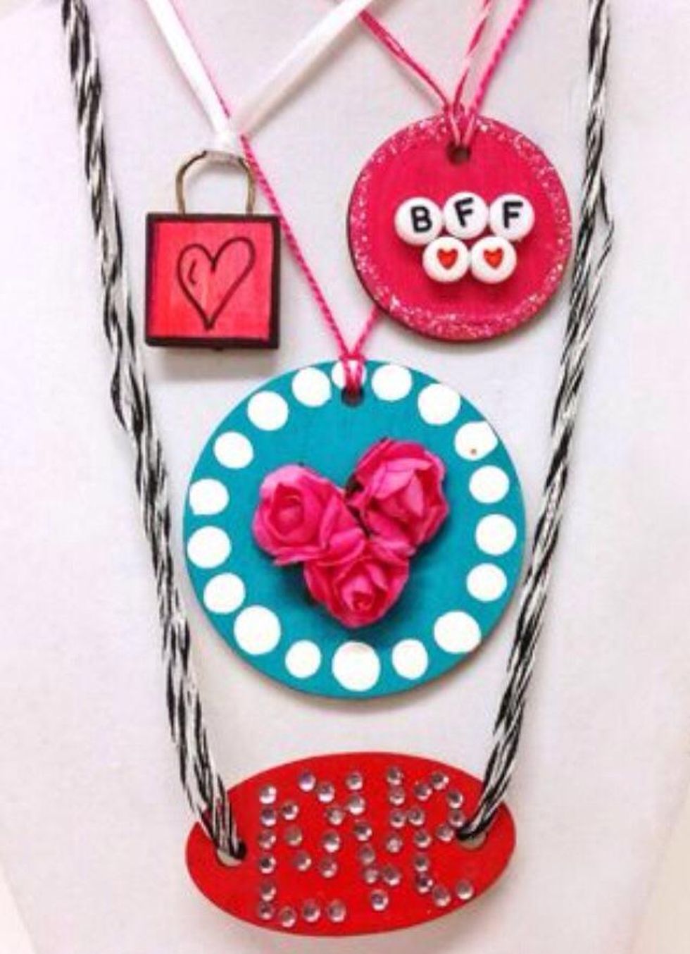 Small wood pieces with pre - drilled holes , white craft glue , embroidery floss , yarn or ribbon , craft paint and brushes , crystals , glitters and small flowers .