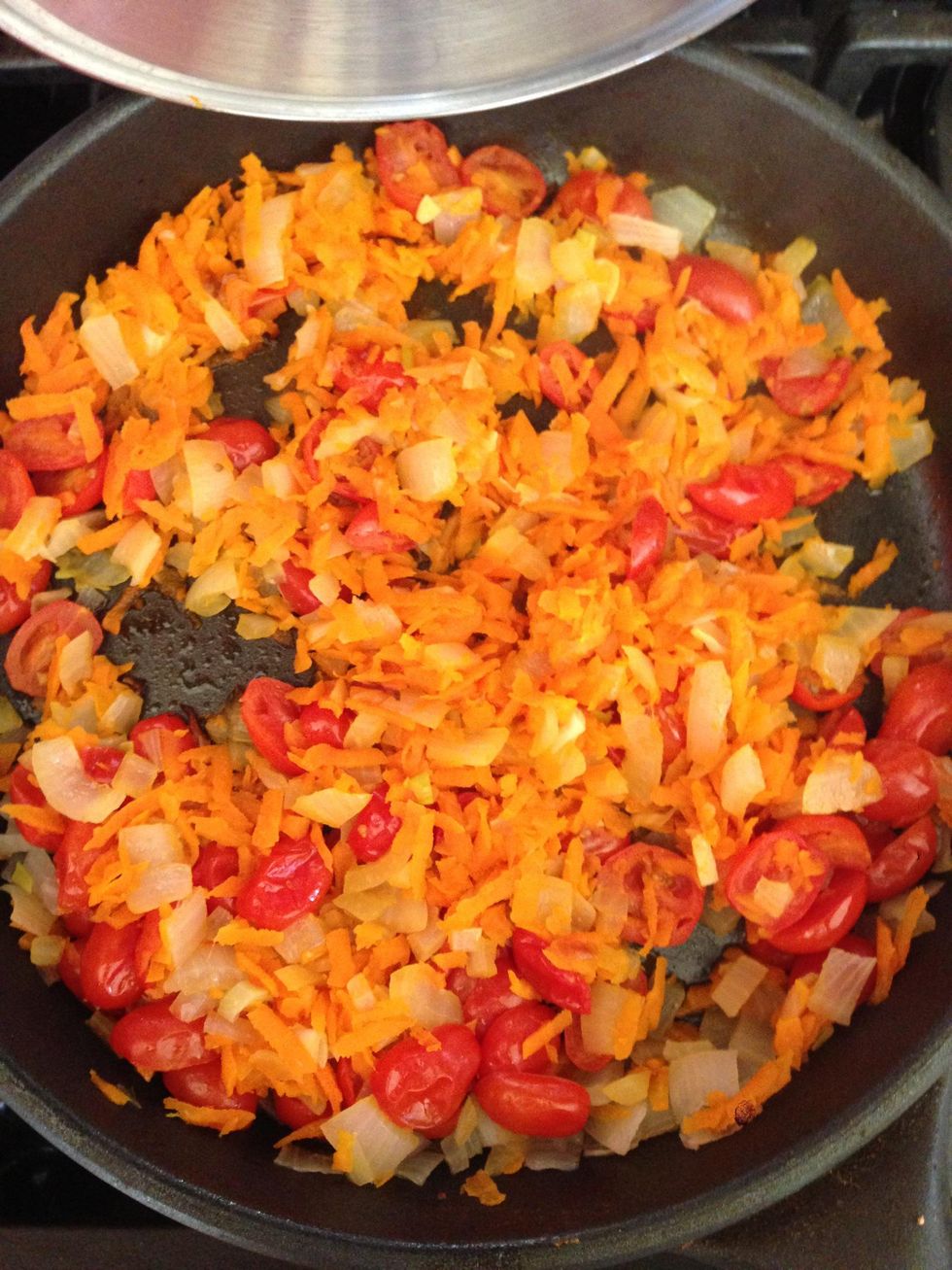 Cut up grape tomatoes, grate carrots and mince onions. Put it all on a skillet and roast with little bit of oil on a slow fire.