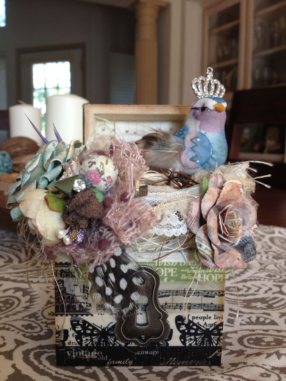 Continue to embellish the box using the paper flowers and adding the keyhole at the bottom.