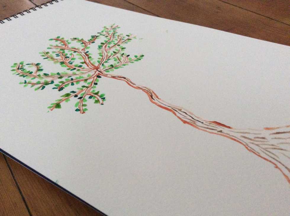 Take your paint brush and dip it into the burnt sienna and draw a line until you get half way up your page, your line does not have to be straight, make it a bit bendy in the lines