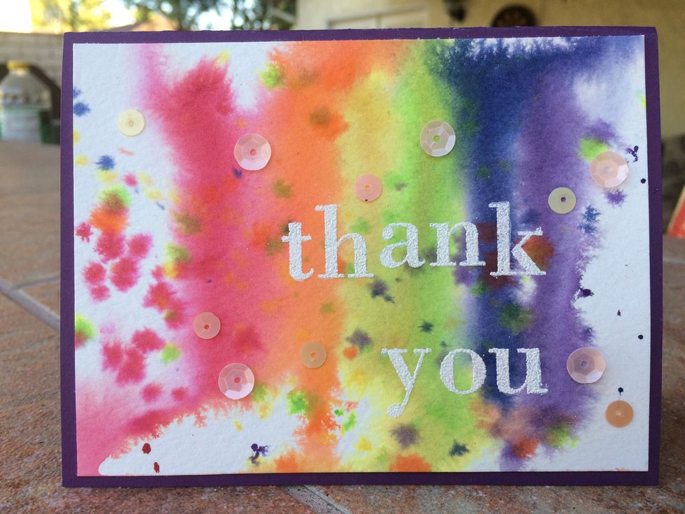 Next, I stamped the sentiment, thank you, with a VersaMark Embossing Ink Pad. I heat embossed with white embossing powder. Lastly, I glued sequins around the card, giving it a "bokeh" look.