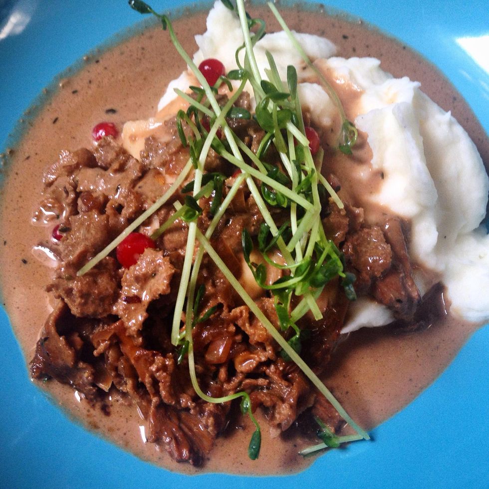Add some butter to the pan and saute the chantarelles. Then add the meat and onion to the pan.