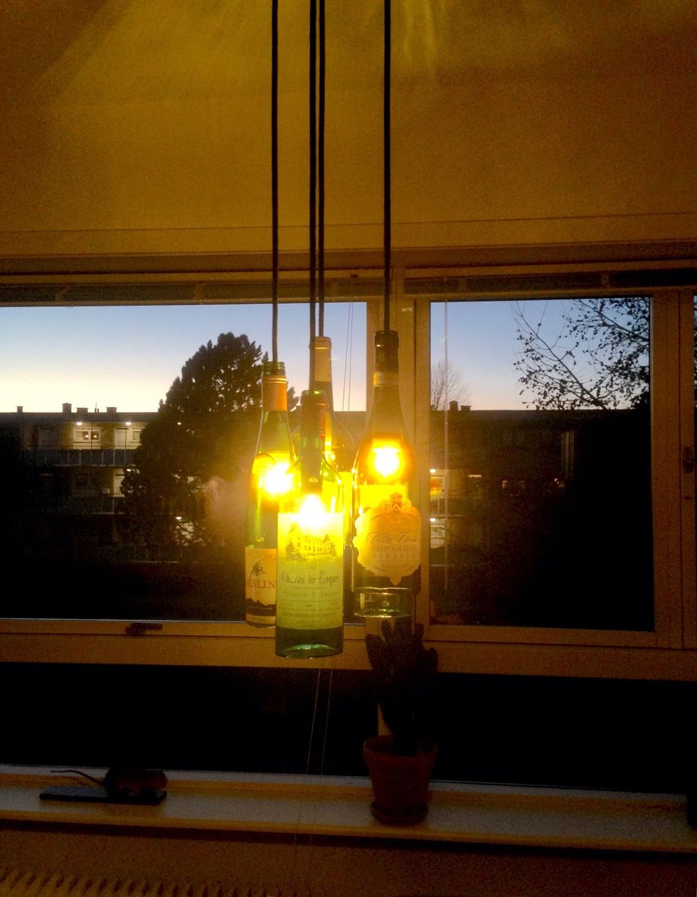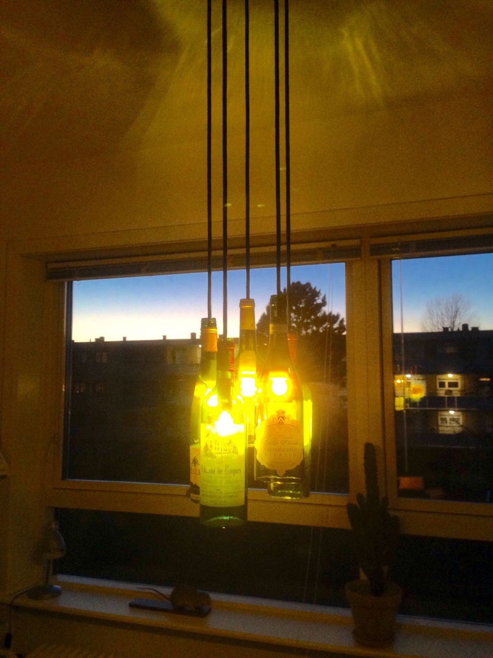 Hang it from the ceiling. Adjust the length of the cords so the bottles look harmonic