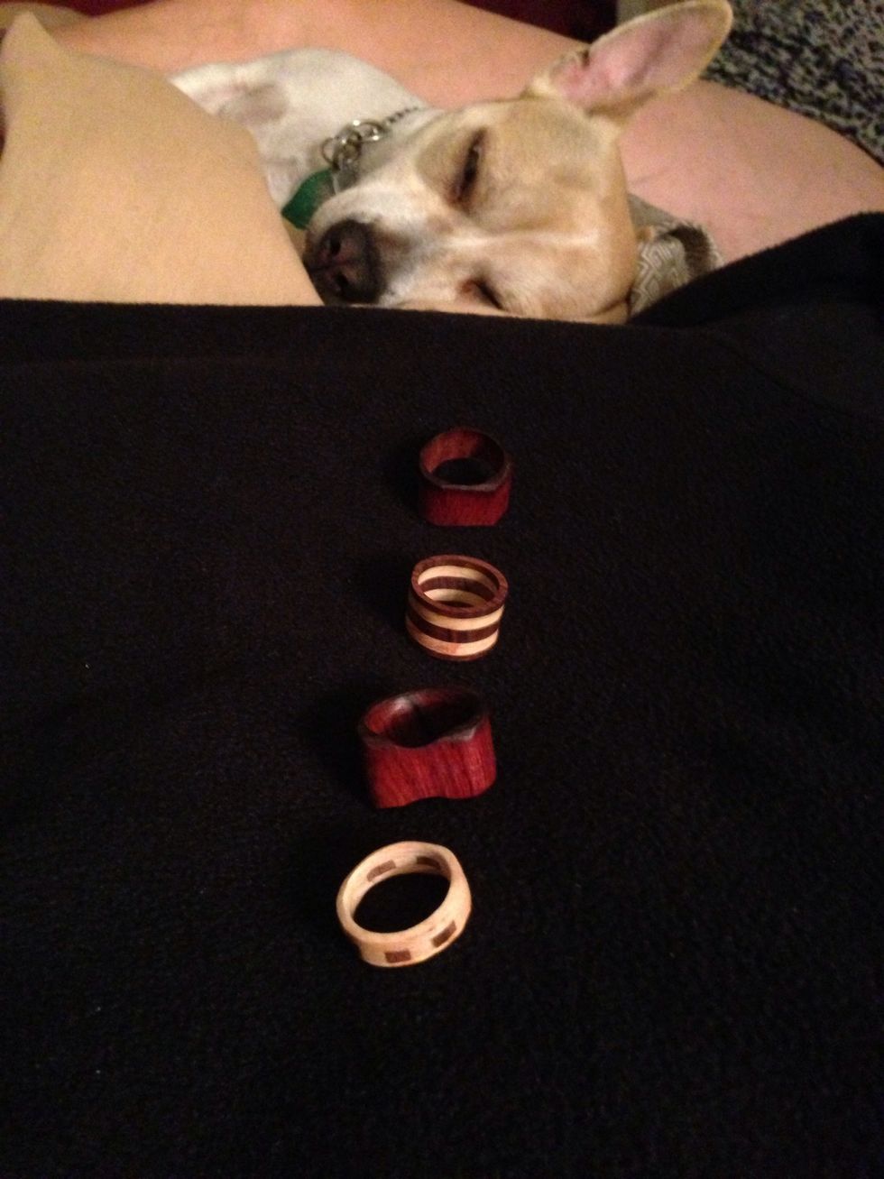 Tap on the picture to view my first four rings. The two rings on the end or laminated (glued) and the two in the middle are exotic wood from one solid piece. Check out my other woodworking projects.