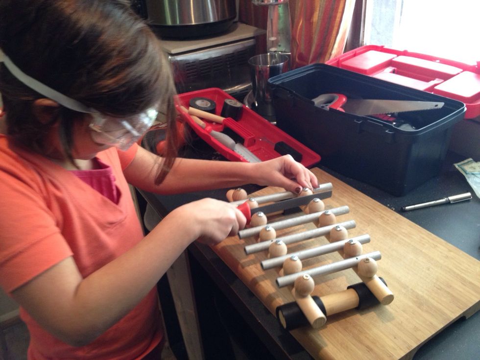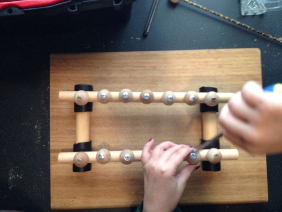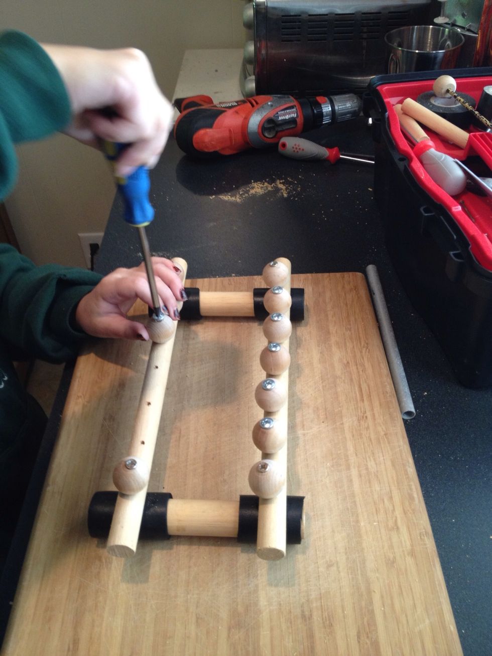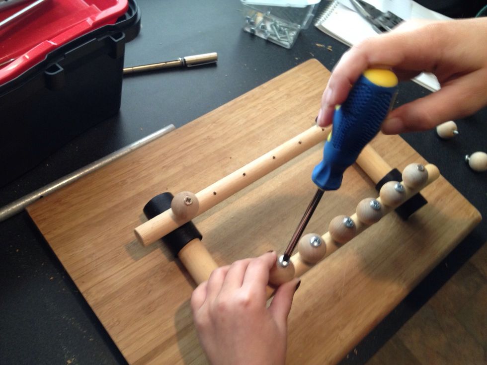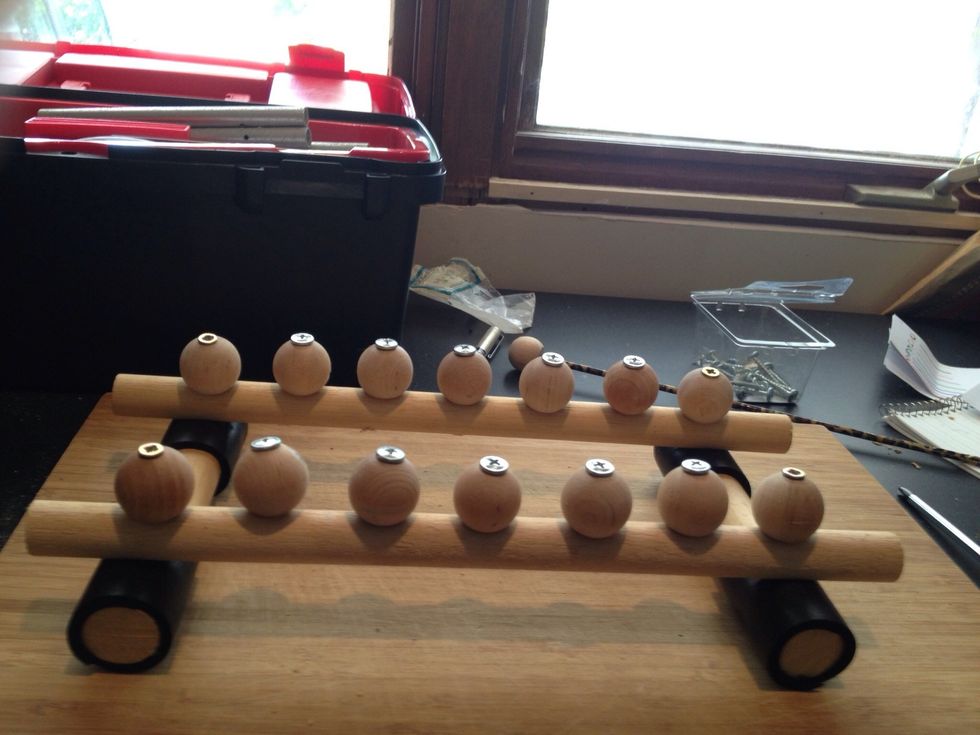 Attach the remaining 10 knobs to the base of your xylophone. She used a screw driver to attach hers, you can also use a drill.