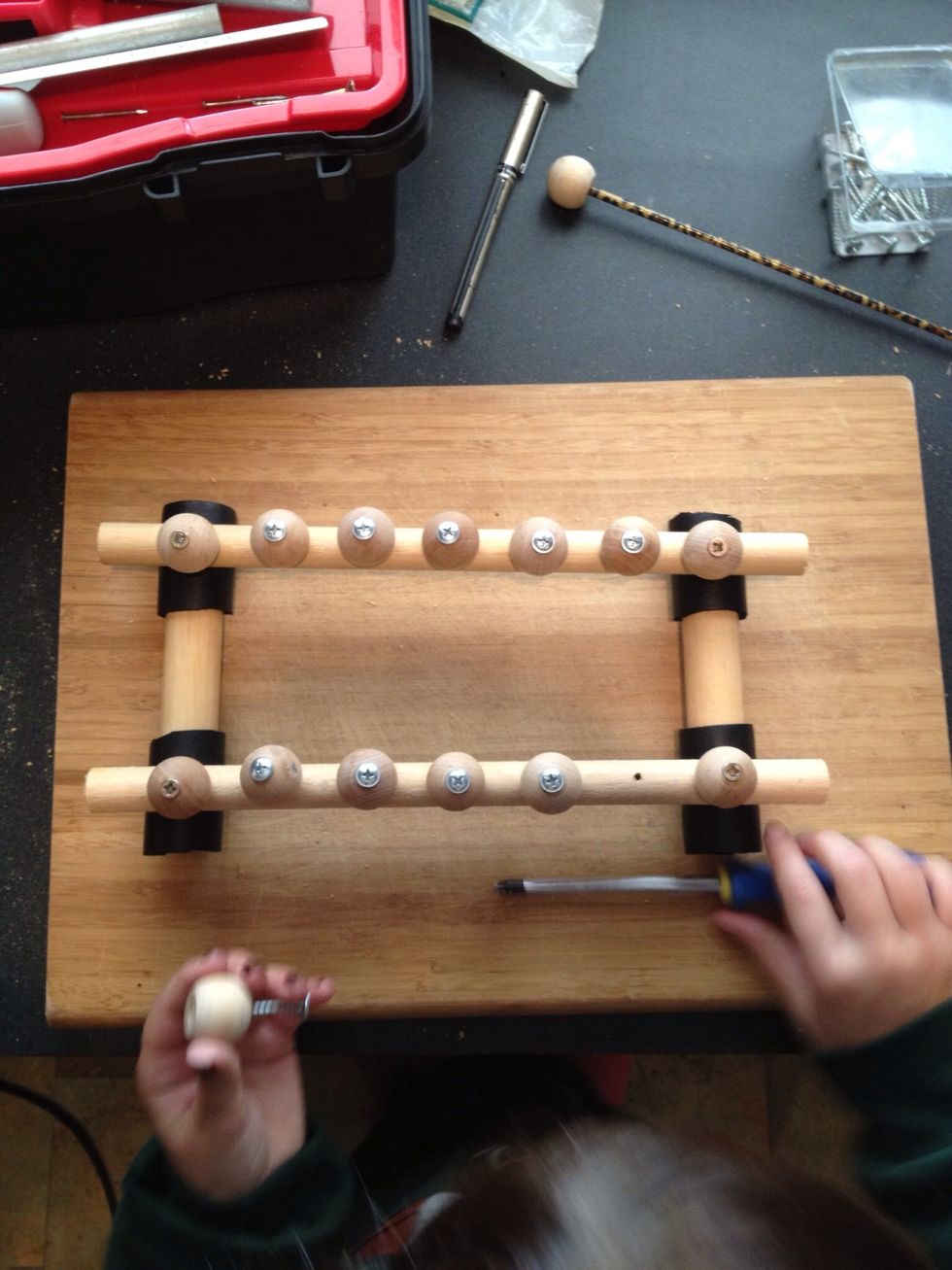 Cut the foam sleeve into 4 pieces and slide onto the legs of the xylophone. Drill the screw through the ball knob and the base dowel rod-into the legs.