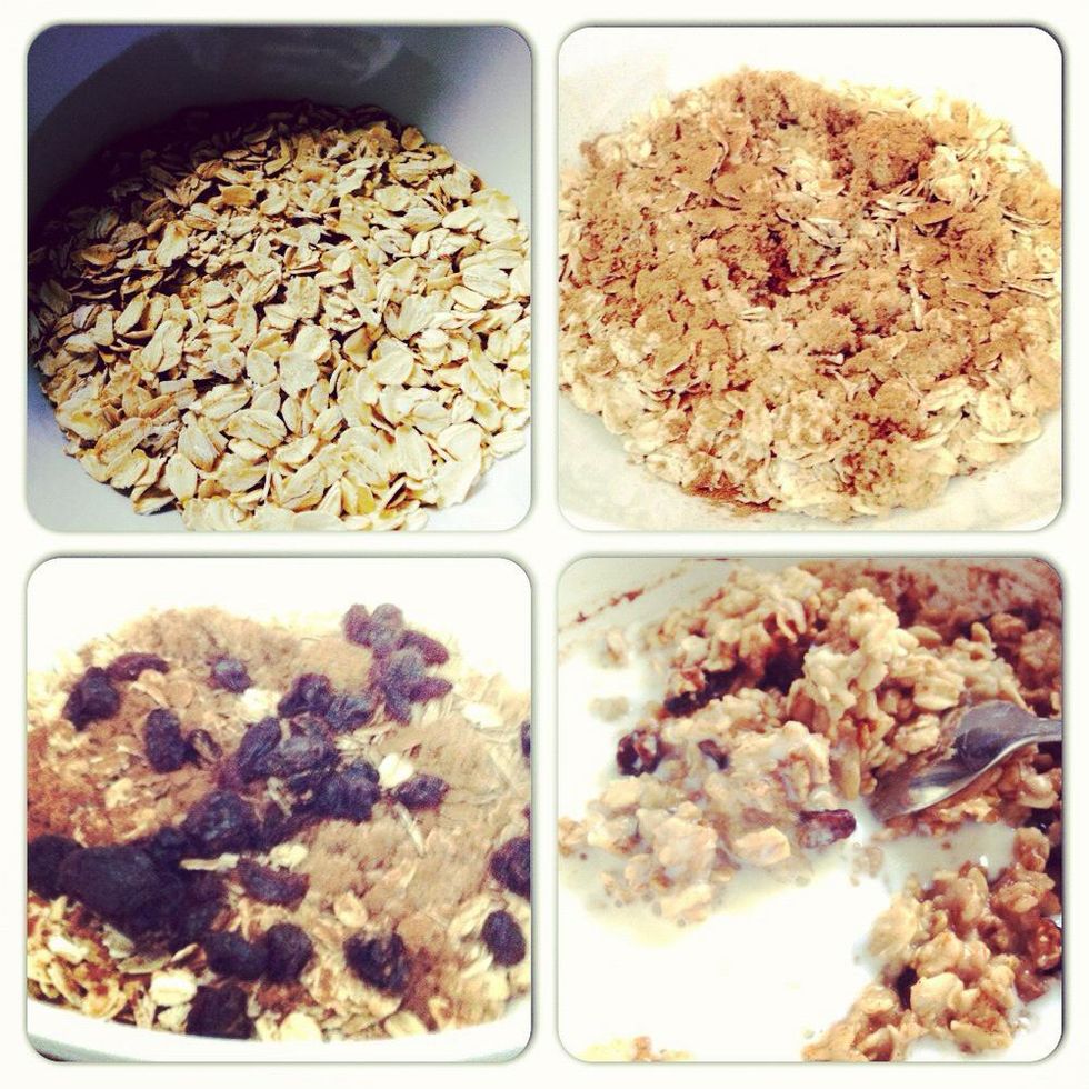 Add water just right below the oatmeal line. Stir the oatmeal. Place the bowl in the microwave for about two mins. When done add a little milk to cool it down. It's so yummy.