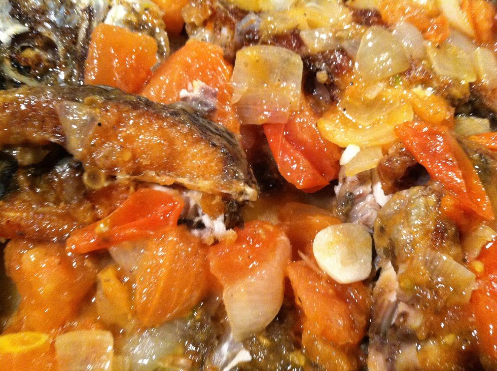 Add your fry fish try to delicately pour some of the tomatoes and onion on top of it