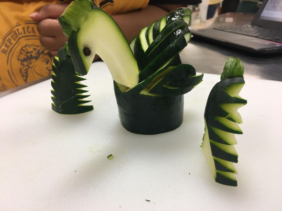 Now carve the eyes into one side by digging the knife in the Zucchini where an eye would go, and turn your knife in a circle.