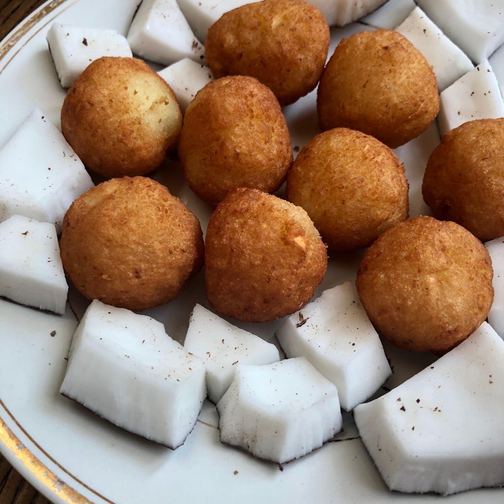 Heat oil. Cook the cassava's balls in the oil for a few minutes : they must be golden and the inside must be cooked.