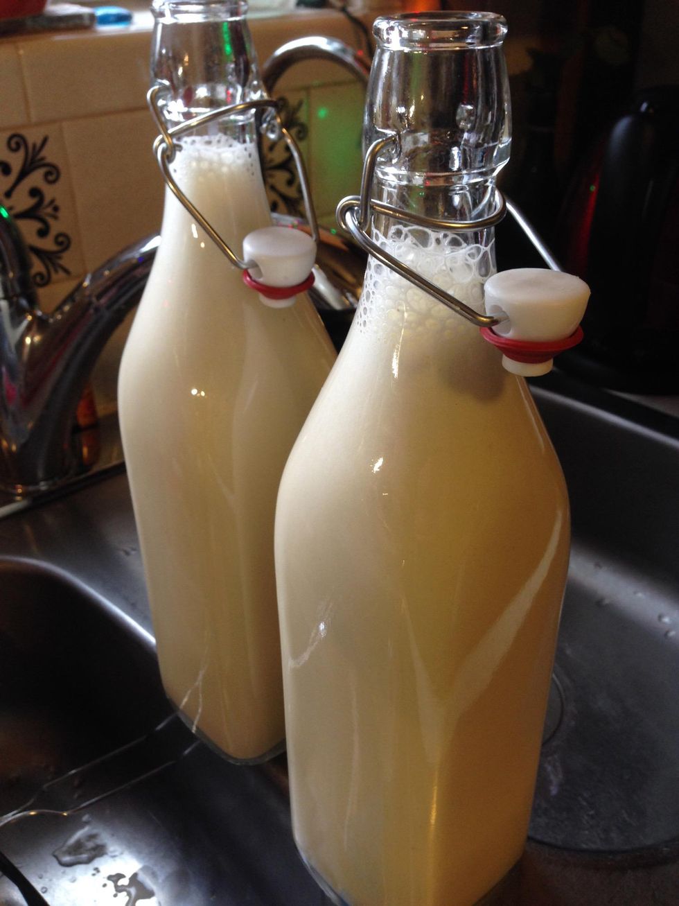 Set up your clean bottles over the sink (because you know, accidents happen), and insert a funnel. Using a ladle or a cup, transfer the eggnog from the mixing bowl to the bottle.