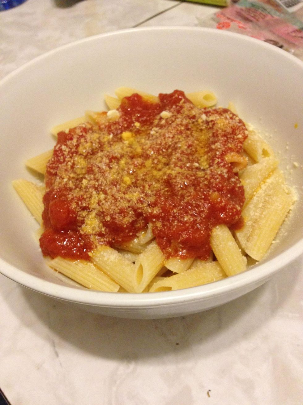 Serve. Mine is with Parmesan cheese, of course :D Depending on how much sauce you use it should make enough for 4ish people