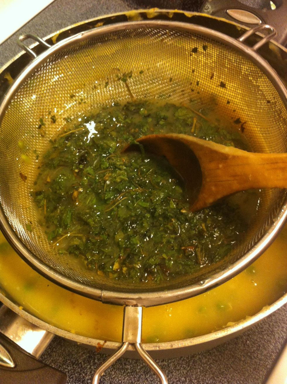Put guascas in a drainer and shake to take out all the little pieces of leaf.