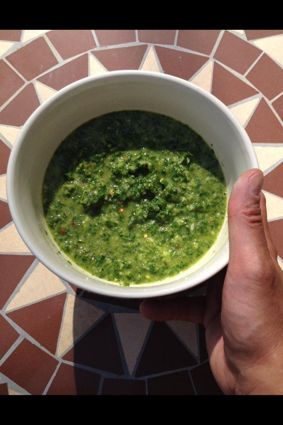 Presto! Argentinian pesto! Amazing on steak, chicken, fish, grilled veggies, roast potatoes, you name it! Try marinating steak or fish in it or stir a few tbsp into cooked pasta for some zang! Enjoy!
