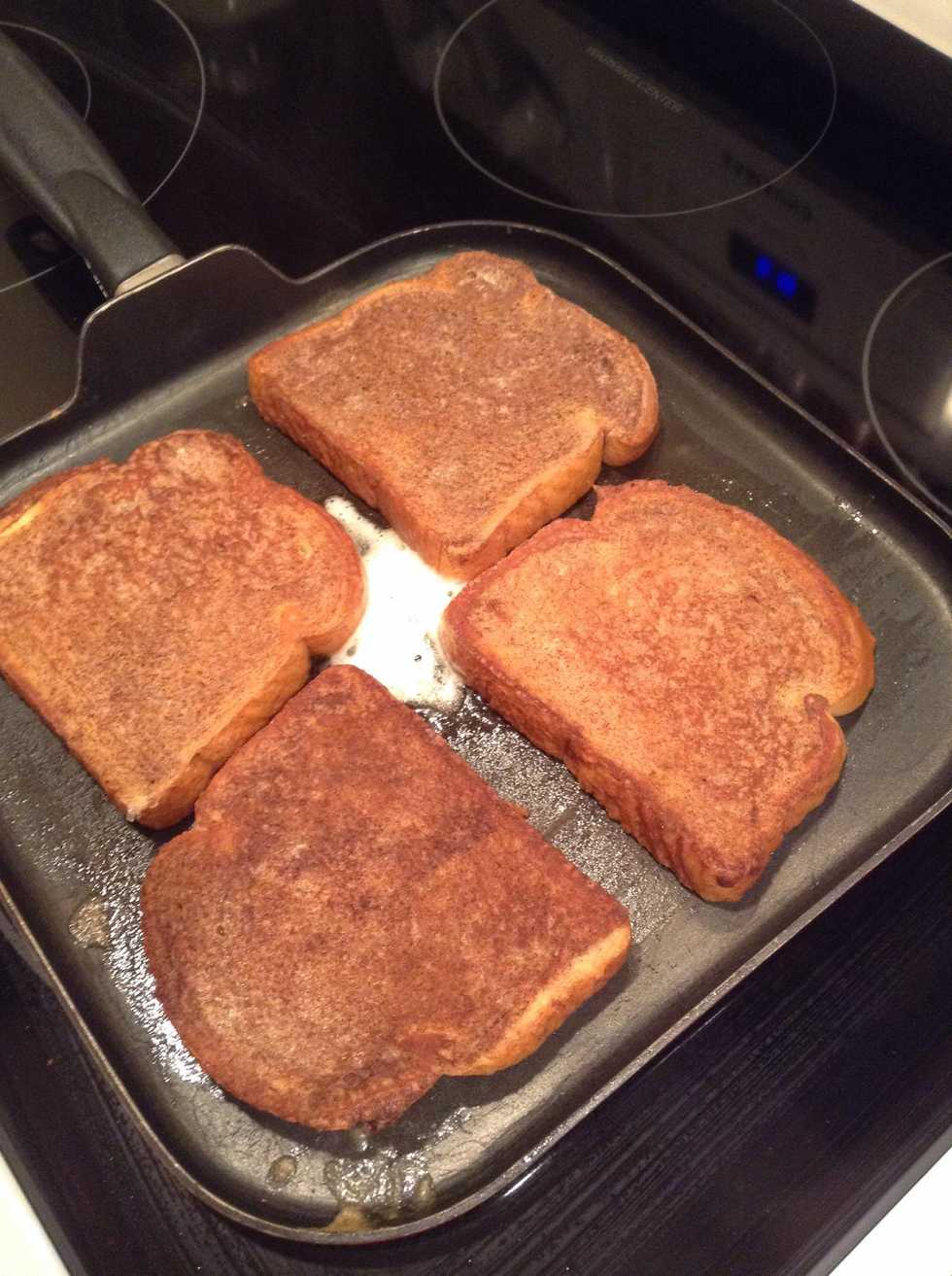 Then, put the bread in the pan. Cook on each side for 3-4 mins or until brown and crispy