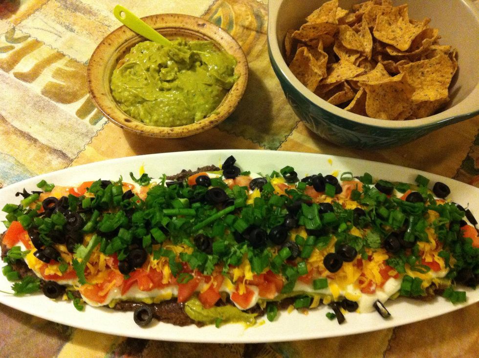 Then we add our last three layers that consist of cilantro freshly chopped, Scallions and black olives . serve with fresh nacho chips .And there you have your eight layer dip, enjoy !! Viva Mexico!!