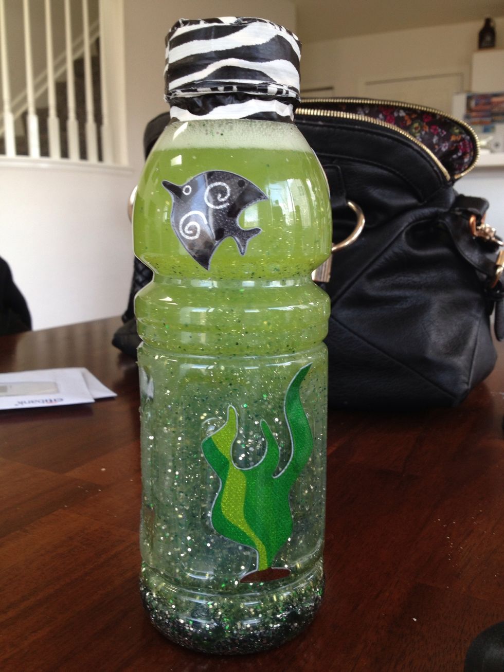 Add some stickers to the outside for a finished look. This bottle is small enough for my 2 year old to use on his own. It's a quiet and calming toy that you shake, then watch as everything settles.